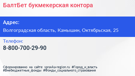 БалтБет, букмекерская контора по адресу Волгоградская область, Камышин, Октябрьская, 25 в дальнейшем Организация, размещена в следующих категориях: