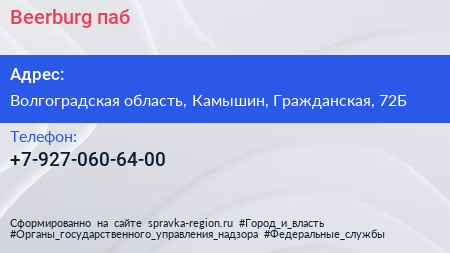Beerburg, паб по адресу Волгоградская область, Камышин, Гражданская, 72Б в дальнейшем Организация, размещена в следующих категориях: