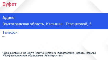 Буфет по адресу Волгоградская область, Камышин, Терешковой, 5 в дальнейшем Организация, размещена в следующих категориях: