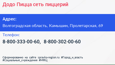 Додо Пицца, сеть пиццерий по адресу Волгоградская область, Камышин, Пролетарская, 69 в дальнейшем Организация, размещена в следующих категориях: