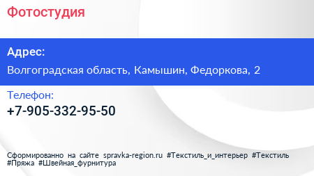 Фотостудия по адресу Волгоградская область, Камышин, Федоркова, 2 в дальнейшем Организация, размещена в следующих категориях: