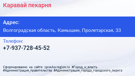 Каравай, пекарня по адресу Волгоградская область, Камышин, Пролетарская, 33 в дальнейшем Организация, размещена в следующих категориях: