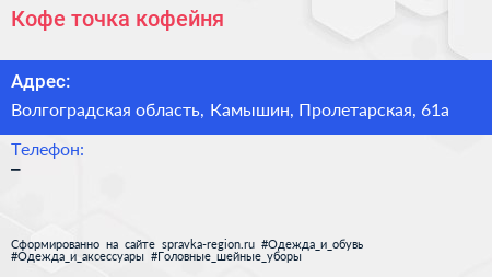 Кофе-точка, кофейня по адресу Волгоградская область, Камышин, Пролетарская, 61а в дальнейшем Организация, размещена в следующих категориях:
