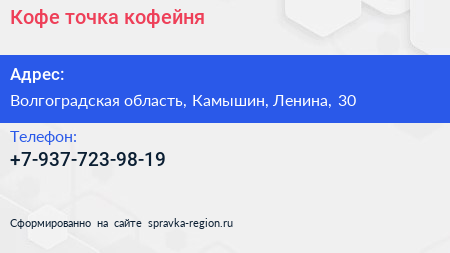 Кофе-точка, кофейня по адресу Волгоградская область, Камышин, Ленина, 30 в дальнейшем Организация, размещена в следующих категориях: