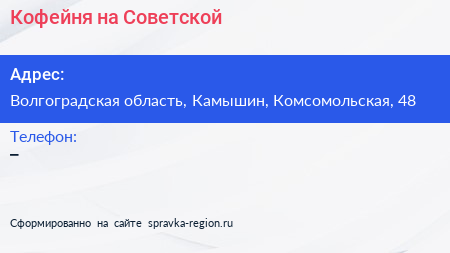 Кофейня на Советской по адресу Волгоградская область, Камышин, Комсомольская, 48 в дальнейшем Организация, размещена в следующих категориях: