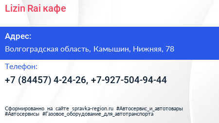 Lizin Rai, кафе по адресу Волгоградская область, Камышин, Нижняя, 78 в дальнейшем Организация, размещена в следующих категориях: