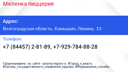 Меленка, пиццерия по адресу Волгоградская область, Камышин, Ленина, 13 в дальнейшем Организация, размещена в следующих категориях: