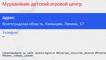 Муравейник, детский игровой центр по адресу Волгоградская область, Камышин, Ленина, 17 в дальнейшем Организация, размещена в следующих категориях: