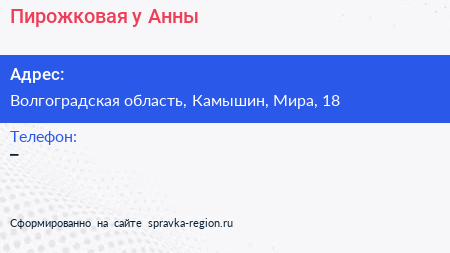 Пирожковая у Анны по адресу Волгоградская область, Камышин, Мира, 18 в дальнейшем Организация, размещена в следующих категориях: