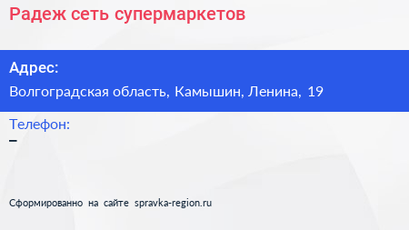 Радеж, сеть супермаркетов по адресу Волгоградская область, Камышин, Ленина, 19 в дальнейшем Организация, размещена в следующих категориях: