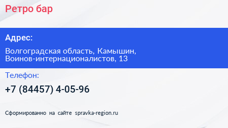 Ретро, бар по адресу Волгоградская область, Камышин, Воинов-интернационалистов, 13 в дальнейшем Организация, размещена в следующих категориях: