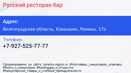 Русский, ресторан-бар по адресу Волгоградская область, Камышин, Ленина, 17а в дальнейшем Организация, размещена в следующих категориях: