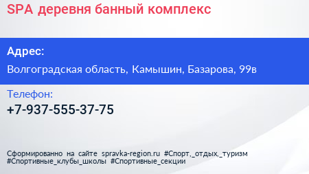 SPA-деревня, банный комплекс по адресу Волгоградская область, Камышин, Базарова, 99в в дальнейшем Организация, размещена в следующих категориях: