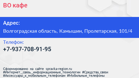 ВО, кафе по адресу Волгоградская область, Камышин, Пролетарская, 101/4 в дальнейшем Организация, размещена в следующих категориях: