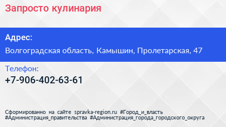 Запросто, кулинария по адресу Волгоградская область, Камышин, Пролетарская, 47 в дальнейшем Организация, размещена в следующих категориях: