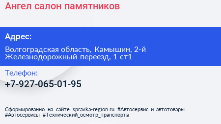 Ангел, салон памятников по адресу Волгоградская область, Камышин, 2-й Железнодорожный переезд, 1 ст1 в дальнейшем Организация, размещена в следующих категориях: