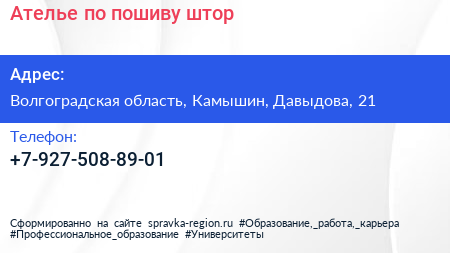 Ателье по пошиву штор по адресу Волгоградская область, Камышин, Давыдова, 21 в дальнейшем Организация, размещена в следующих категориях: