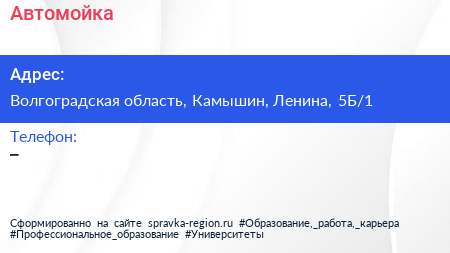 Автомойка по адресу Волгоградская область, Камышин, Ленина, 5Б/1 в дальнейшем Организация, размещена в следующих категориях: