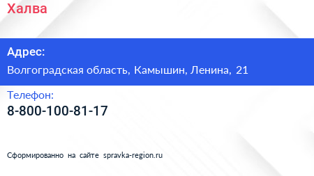 Халва по адресу Волгоградская область, Камышин, Ленина, 21 в дальнейшем Организация, размещена в следующих категориях: