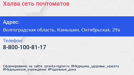 Халва, сеть почтоматов по адресу Волгоградская область, Камышин, Октябрьская, 29а в дальнейшем Организация, размещена в следующих категориях: