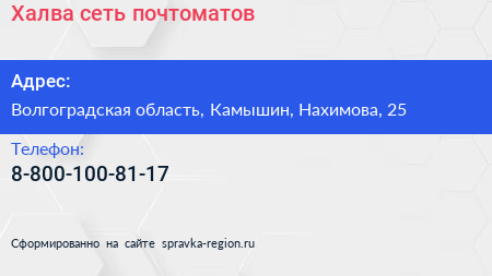 Халва, сеть почтоматов по адресу Волгоградская область, Камышин, Нахимова, 25 в дальнейшем Организация, размещена в следующих категориях: