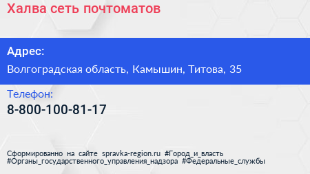 Халва, сеть почтоматов по адресу Волгоградская область, Камышин, Титова, 35 в дальнейшем Организация, размещена в следующих категориях:
