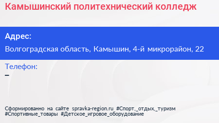 Камышинский политехнический колледж по адресу Волгоградская область, Камышин, 4-й микрорайон, 22 в дальнейшем Организация, размещена в следующих категориях: