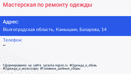 Мастерская по ремонту одежды по адресу Волгоградская область, Камышин, Базарова, 14 в дальнейшем Организация, размещена в следующих категориях: