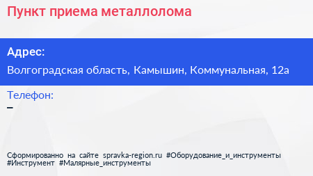 Пункт приема металлолома по адресу Волгоградская область, Камышин, Коммунальная, 12а в дальнейшем Организация, размещена в следующих категориях: