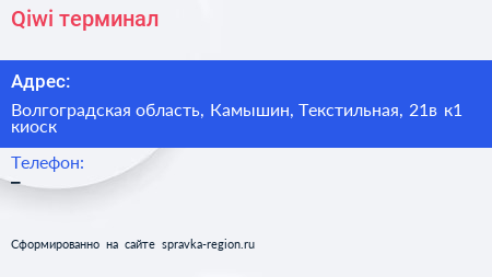 Qiwi, терминал по адресу Волгоградская область, Камышин, Текстильная, 21в к1 киоск в дальнейшем Организация, размещена в следующих категориях: