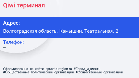 Qiwi, терминал по адресу Волгоградская область, Камышин, Театральная, 2 в дальнейшем Организация, размещена в следующих категориях: