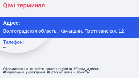 Qiwi, терминал по адресу Волгоградская область, Камышин, Партизанская, 12 в дальнейшем Организация, размещена в следующих категориях: