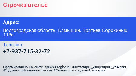 Строчка, ателье по адресу Волгоградская область, Камышин, Братьев Сорокиных, 118а в дальнейшем Организация, размещена в следующих категориях: