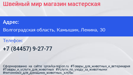 Швейный мир, магазин-мастерская по адресу Волгоградская область, Камышин, Ленина, 30 в дальнейшем Организация, размещена в следующих категориях: