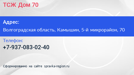 ТСЖ Дом №70 по адресу Волгоградская область, Камышин, 5-й микрорайон, 70 в дальнейшем Организация, размещена в следующих категориях: