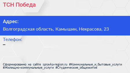 ТСН Победа по адресу Волгоградская область, Камышин, Некрасова, 23 в дальнейшем Организация, размещена в следующих категориях: