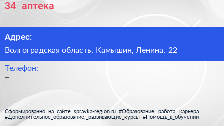 34+, аптека по адресу Волгоградская область, Камышин, Ленина, 22 в дальнейшем Организация, размещена в следующих категориях: