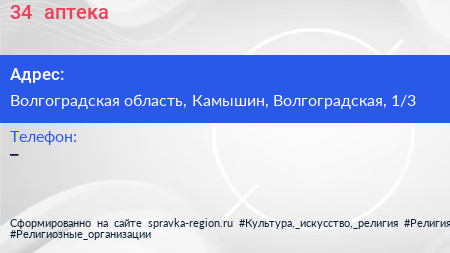 34+, аптека по адресу Волгоградская область, Камышин, Волгоградская, 1/3 в дальнейшем Организация, размещена в следующих категориях: