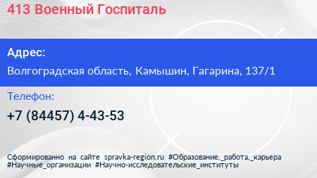 413 Военный Госпиталь по адресу Волгоградская область, Камышин, Гагарина, 137/1 в дальнейшем Организация, размещена в следующих категориях: