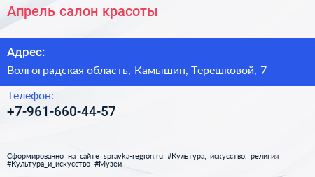 Апрель, салон красоты по адресу Волгоградская область, Камышин, Терешковой, 7 в дальнейшем Организация, размещена в следующих категориях: