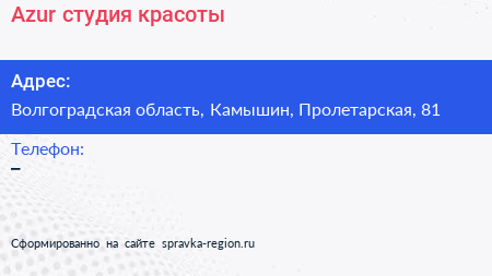 Azur, студия красоты по адресу Волгоградская область, Камышин, Пролетарская, 81 в дальнейшем Организация, размещена в следующих категориях: