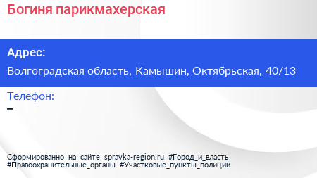 Богиня, парикмахерская по адресу Волгоградская область, Камышин, Октябрьская, 40/13 в дальнейшем Организация, размещена в следующих категориях: