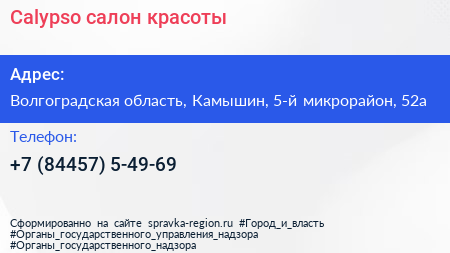 Calypso, салон красоты по адресу Волгоградская область, Камышин, 5-й микрорайон, 52а в дальнейшем Организация, размещена в следующих категориях: