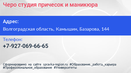 Черо, студия причесок и маникюра по адресу Волгоградская область, Камышин, Базарова, 144 в дальнейшем Организация, размещена в следующих категориях: