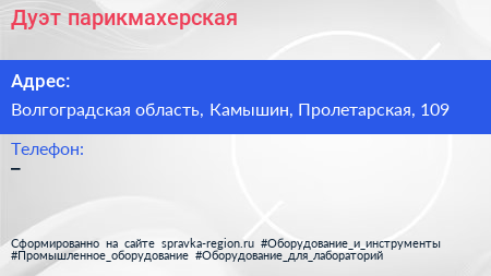 Дуэт, парикмахерская по адресу Волгоградская область, Камышин, Пролетарская, 109 в дальнейшем Организация, размещена в следующих категориях: