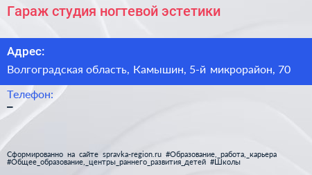 Гараж, студия ногтевой эстетики по адресу Волгоградская область, Камышин, 5-й микрорайон, 70 в дальнейшем Организация, размещена в следующих категориях:
