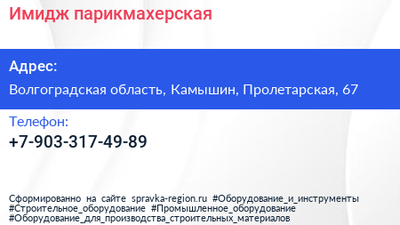 Имидж, парикмахерская по адресу Волгоградская область, Камышин, Пролетарская, 67 в дальнейшем Организация, размещена в следующих категориях: