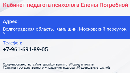 Кабинет педагога-психолога Елены Погребной по адресу Волгоградская область, Камышин, Московский переулок, 9 в дальнейшем Организация, размещена в следующих категориях: