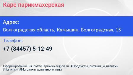 Каре, парикмахерская по адресу Волгоградская область, Камышин, Волгоградская, 15 в дальнейшем Организация, размещена в следующих категориях: