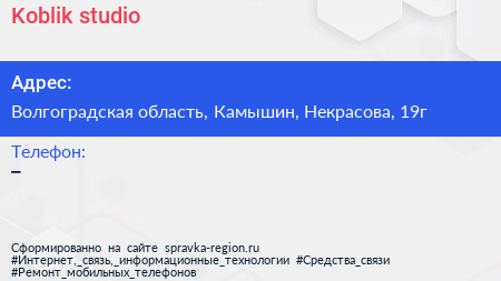 Koblik studio по адресу Волгоградская область, Камышин, Некрасова, 19г в дальнейшем Организация, размещена в следующих категориях: